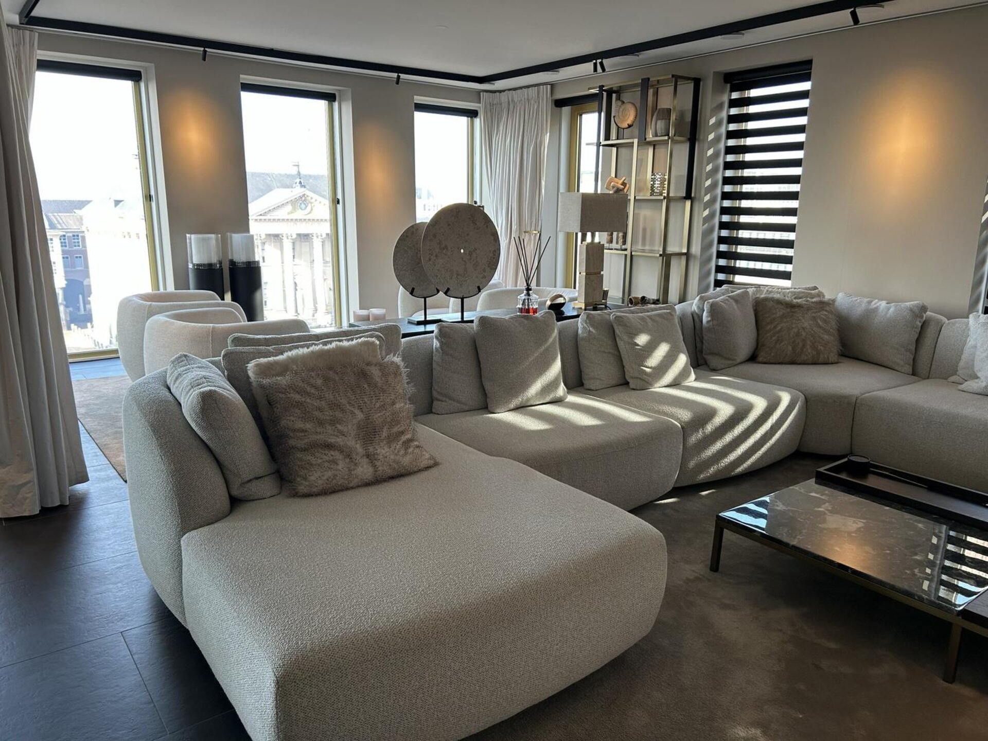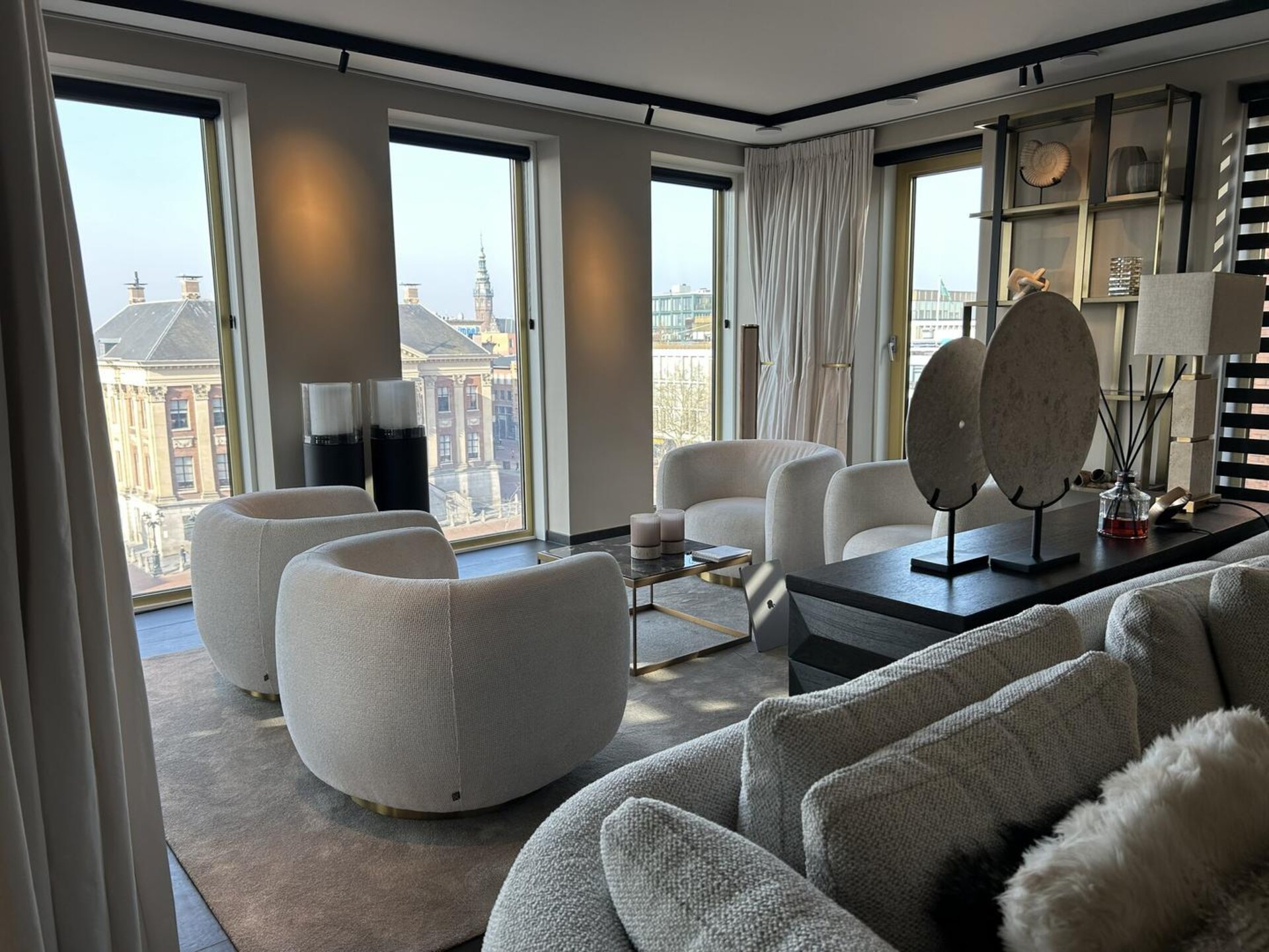 Bij binnenkomst in het appartement leidt de hal naar alle vertrekken. De royale en lichte woonkamer met open keuken (circa 72 m²) vormt het hart van de woning en is voorzien van alle denkbare luxe en comfort. Vanuit de woonkamer is er toegang tot het fraaie terras aan de voorzijde, met een prachtig uitzicht op de Grote Markt van Groningen.