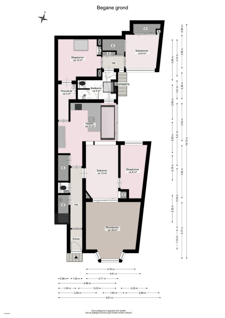 entree/tochtportaal, hal met fraaie granitovloer, trapkast en toilet met wandcloset en fonteintje. Door het daklicht en de schuifpui een lichte woonkeuken (17 m²) voorzien van moderne keuken, geplaatst in hoekopstelling met kastenwand voorzien van diverse inbouwapparatuur. Tevens veel praktische opbergruimte en een separate wasruimte. Vanuit de keuken is er toegang tot de tuin middels een schuifpui. Woonkamer(19 m²) aan de voorzijde met erker en suite deuren naar de eetkamer(13 m²) vanuit de eetkamer is de eerste slaapkamer (8 m²) en de woonkeuken te bereiken. Moderne badkamer voorzien inloopdouche, dubbele wastafel en 2e toilet. Het halletje aan de achterzijde biedt toegang naar een inloopkast en twee slaapkamers van 8 en 12 m², beide met inbouwkasten en de grootste biedt tevens toegang tot de wasruimte.
