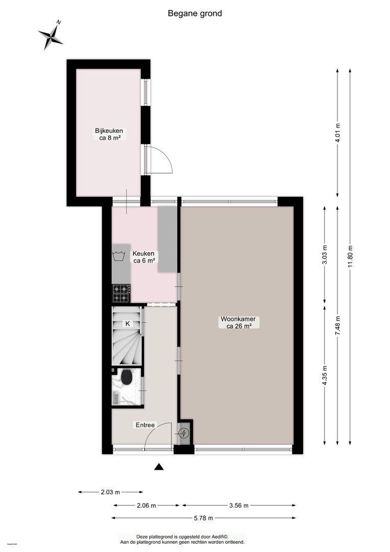 Entree/hal, toilet met fonteintje, lichte woonkamer (ca 26m²) voorzien van nette laminaatvloer. Vanuit de woonkamer heeft u toegang tot de eenvoudige keuken (ca 6m²). De bijkeuken biedt toegang tot de tuin op het Noorden.