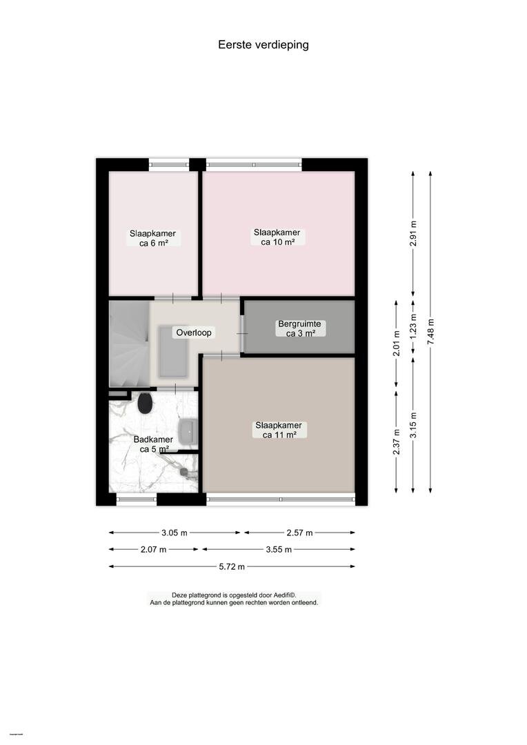Vanuit de overloop heeft u toegang tot 3 slaapkamers, respectievelijk te weten circa 11m², 10m² en 6m². Ook de badkamer (ca 5m²) vindt u op deze verdieping, deze is voorzien van inloopdouche, wastafel en tweede toilet.