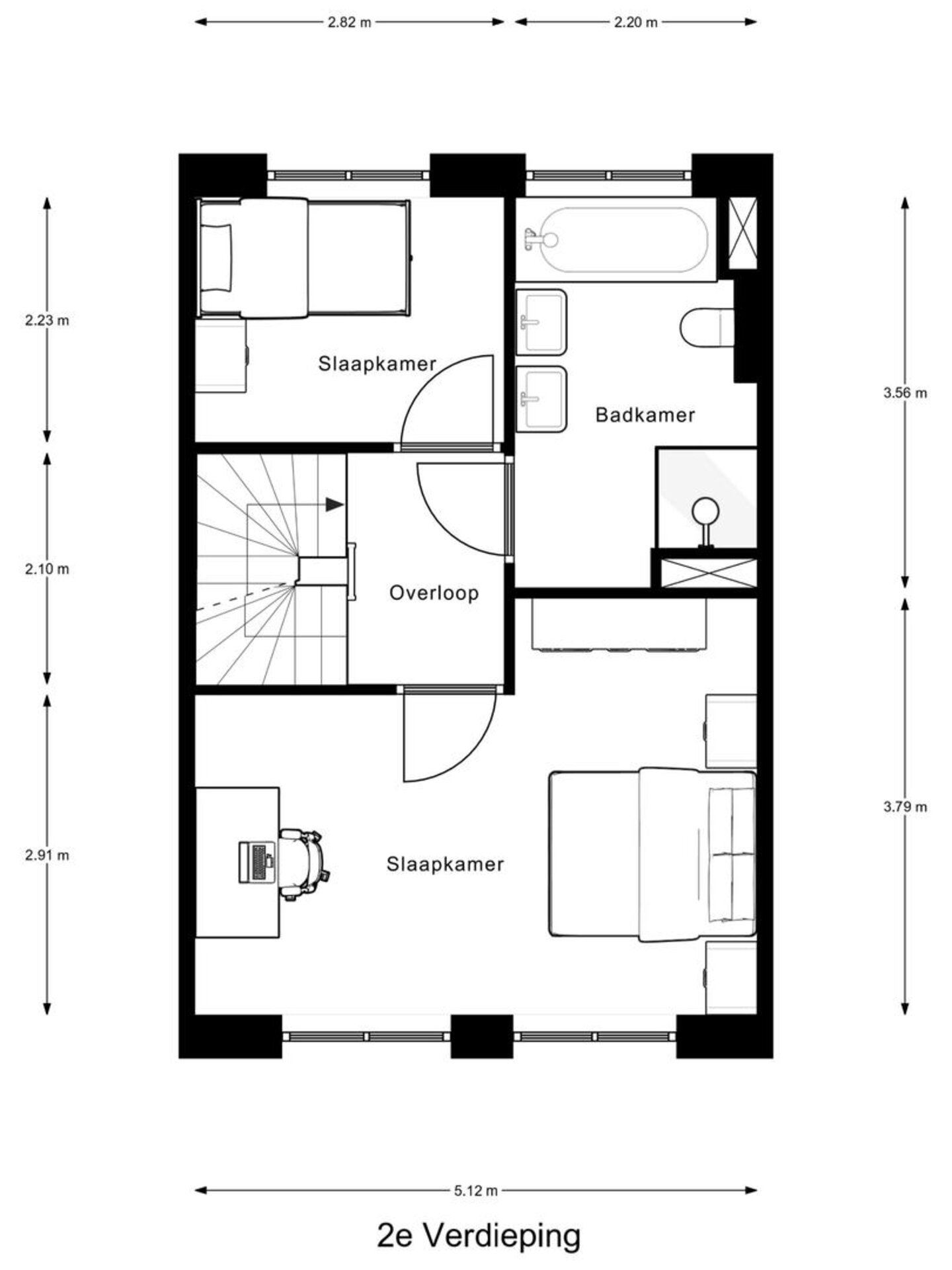 Op de tweede verdieping bevinden zich twee ruime slaapkamers en een luxe badkamer met toilet, douche, ligbad en dubbele wastafel.