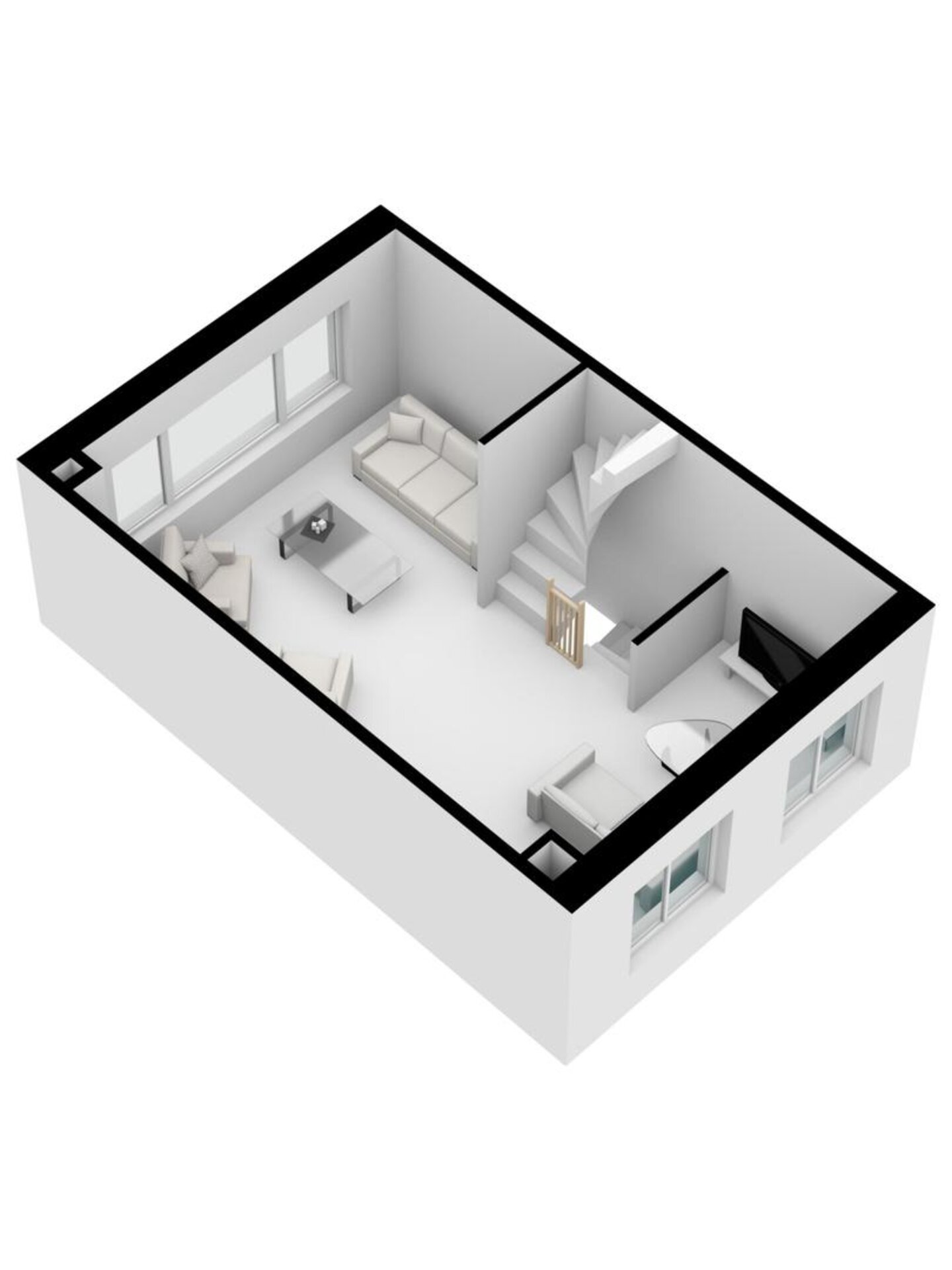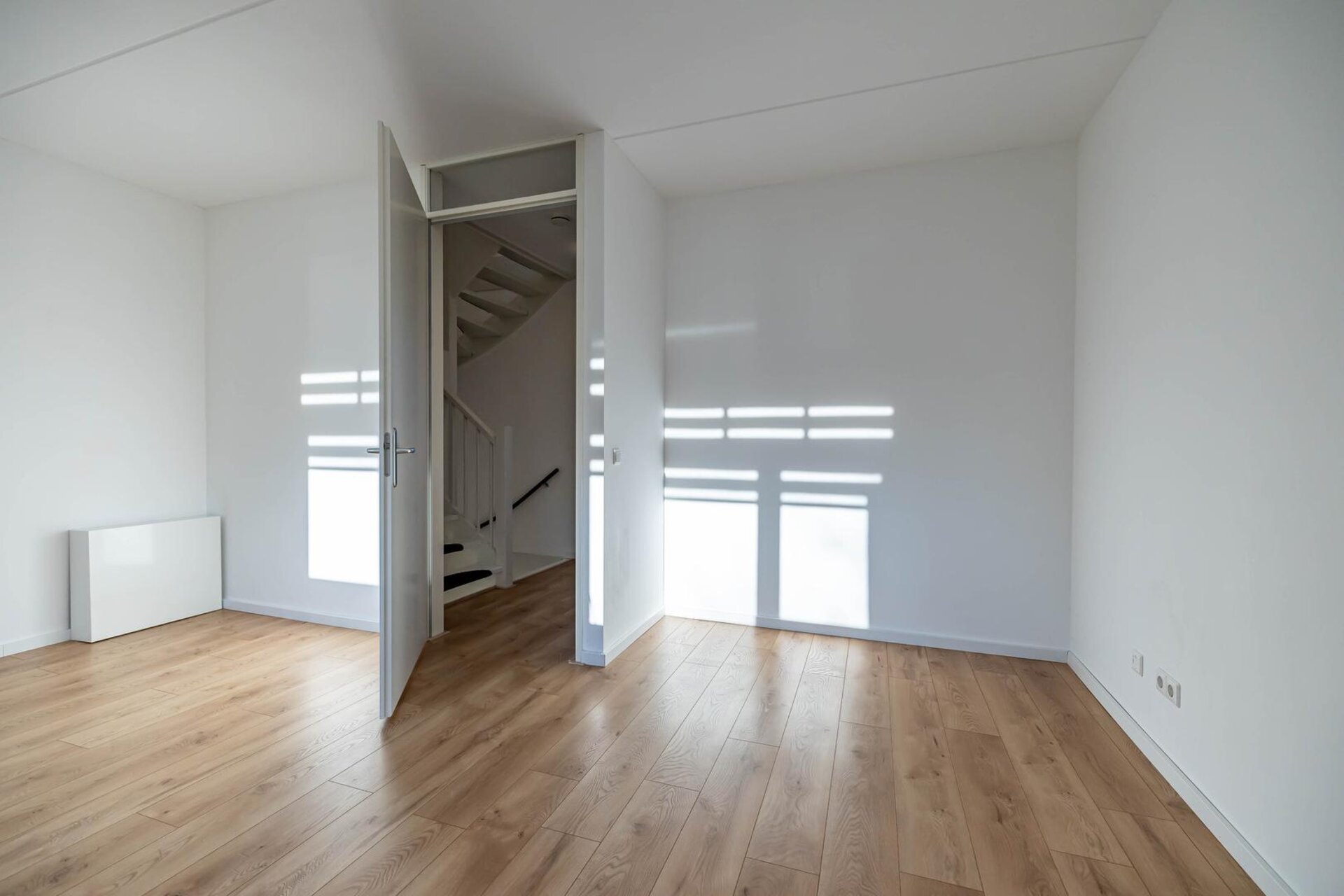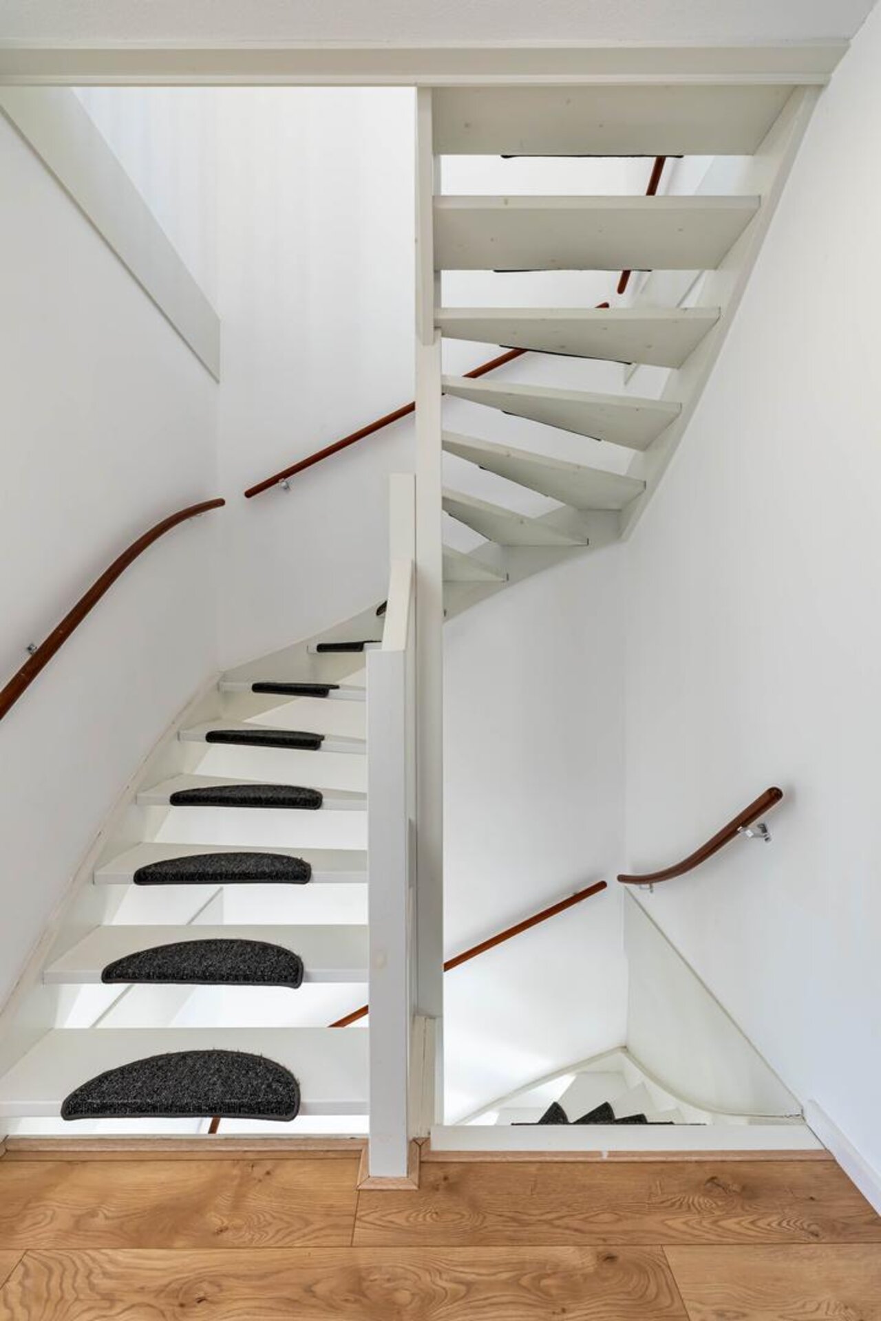 Via de open trap kom je op de eerste verdieping in de ruime, lichte woonkamer.