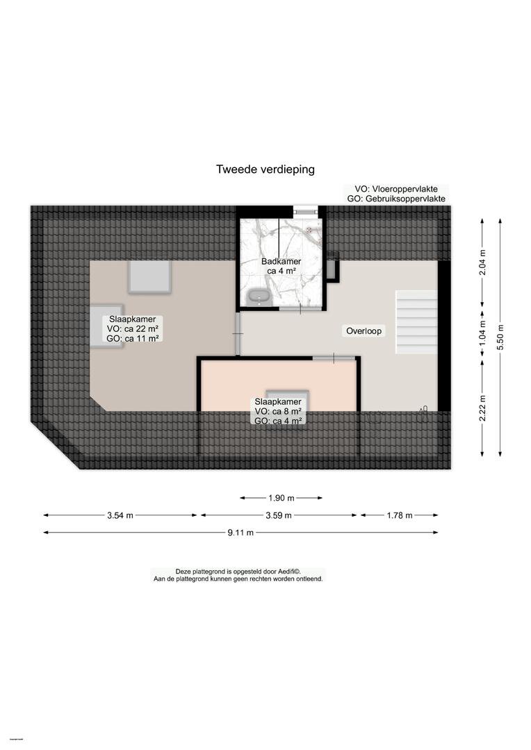 Overloop met C.V.-ketel en wasmachine-aansluiting, badkamer met inloopdouche en wastafel. Tweede slaapkamer (4 m²) ligt onder de kap, derde slaapkamer is 11 m².