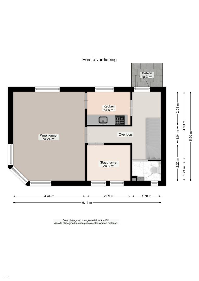 Overloop, toilet, eenvoudige keuken in rechte opstelling, lichte woonkamer van 24 m² voorzien van laminaatvloer, eerste slaapkamer aan de voorzijde van 6 m² en balkon aan de achterzijde op het zuiden.