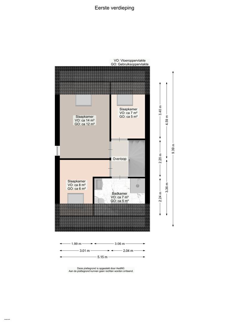 Hier bevinden zich drie slaapkamers van respectievelijk 5, 6 en 12 m². De badkamer beschikt over een douchecabine, wastafel, ligbad en een tweede toilet.