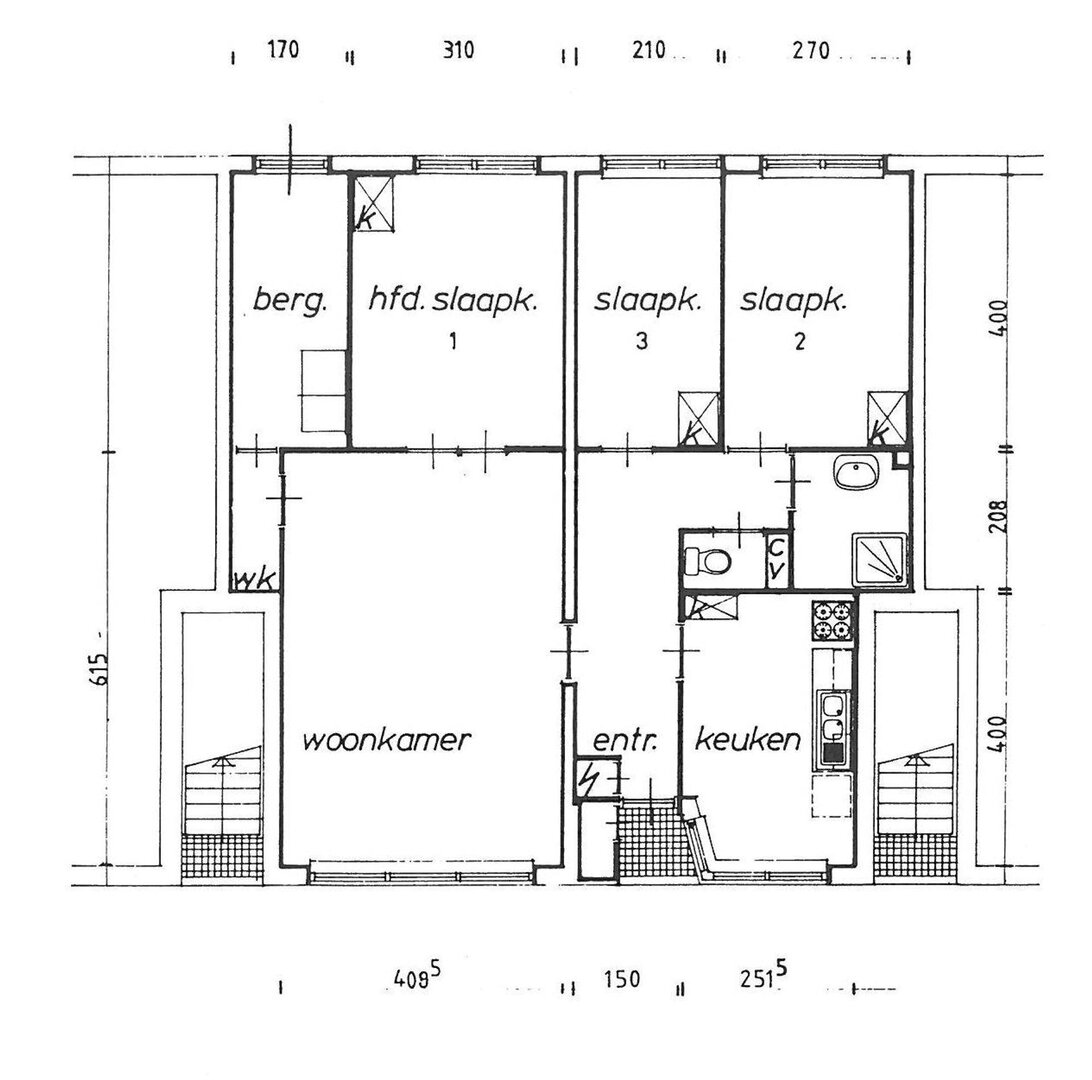 entree, ruime hal, lichte woonkamer van ca. 25 m² met vaste kast, openslaande deuren naar de eerste slaapkamer van ca. 12m², deze heeft een deur naar de ruime achtertuin, dichte keuken van ca. 10 m², badkamer met douche en wastafelmeubel, twee slaapkamers van resp. ca. 8 en 11m², toilet, inpandige berging van ca. 7 m² met wasmachine-aansluiting.
