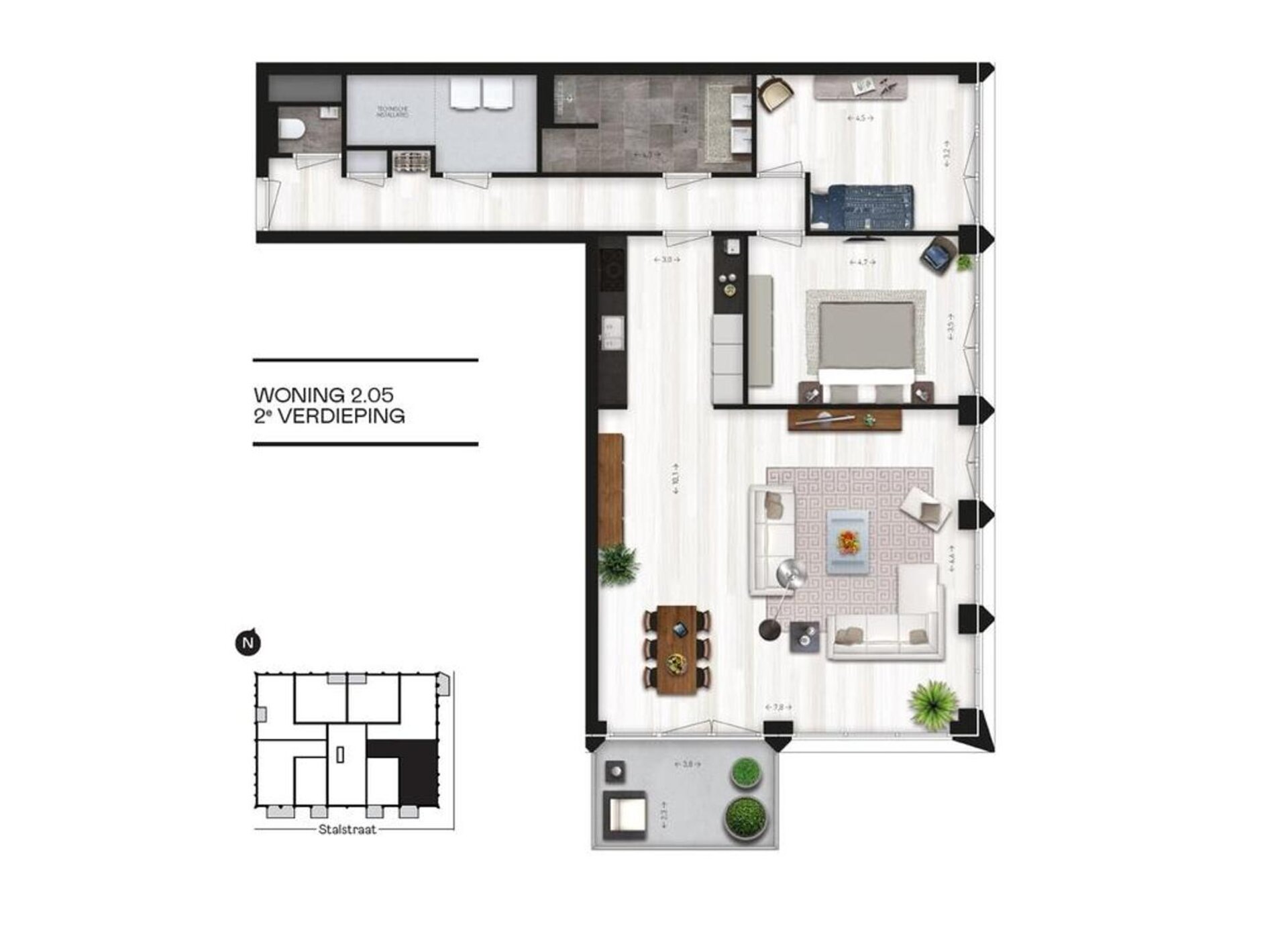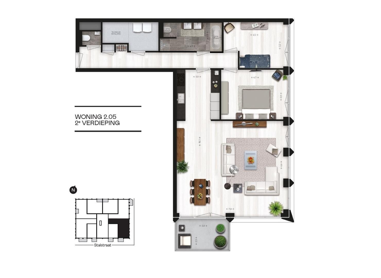 Zeer royaal hoekappartement op de 2e verdieping. Hal met toilet en toegang en tot de ruime berging met warmtepomp en wasmachine/droger. Luxe badkamer met tweede toilet, inloopdouche, dubbele wastafel en bad. Slaapkamer 1 (ca. 16 m2), slaapkamer 2 ( ca. 13 m2). Woonkamer met open keuken (ca. 61 m2). De moderne keuken is van alle gemakken voorzien en alle apparaten zijn ingebouwd (inductie kookplaat, vaatwasser, combi oven, koelkast, klimaatkast). Vanuit de woonkamer toegang het balkon (ca. 9 m2)
