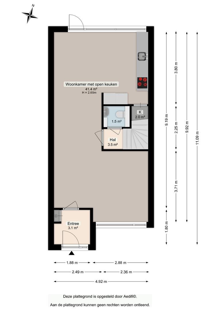 Entree, hal met meterkast, sfeervolle lichte woonkamer 41m² met laminaatvloer en aangrenzend de open keuken met in 2023 vernieuwde keukeninrichting (o.a. vaatwasser, combimagnetron, koelkast, vriezer, inductiekookplaat, afzuigkap met koolstoffilter), trapkast en deur naar de achtertuin met stenen berging en achterom. In de tussenhal bevindt zich het toilet en de trapopgang naar de verdieping.