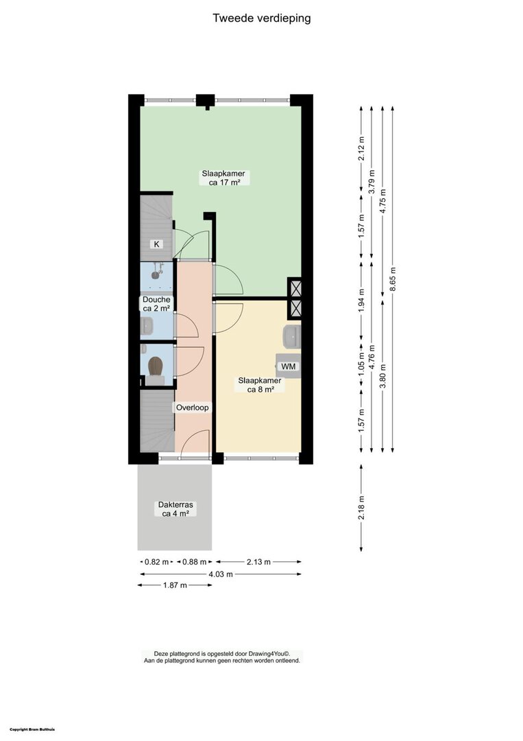 overloop met toegang tot een dakterras (4 m²) en toilet met wandcloset. Verder zijn er 2 slaapkamers (ca. 17m² en ca. 9m²), waarvan de kleinste is voorzien van wastafel en wasmachine-aansluiting, de badkamer is voorzien van met douche en wastafel.