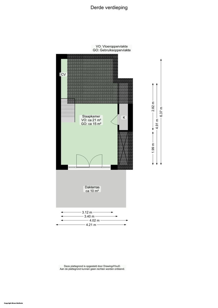 fraaie 3e slaap-/werkkamer van 15 m² met veel bergruimte en toegang tot het fraaie dakterras van 10 m² op het oosten.