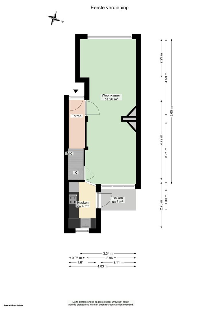 entree/hal, voormalig kamer en suite, met aan de voorzijde de woonkamer met fraai vrij uitzicht op het "Van Brakelplein". De eetkamer aan de achterzijde biedt toegang tot de half open keuken met geplaatst in hoekopstelling en voorzien van diverse inbouwapparatuur. Vanuit de keuken is er toegang tot het balkon op oosten.