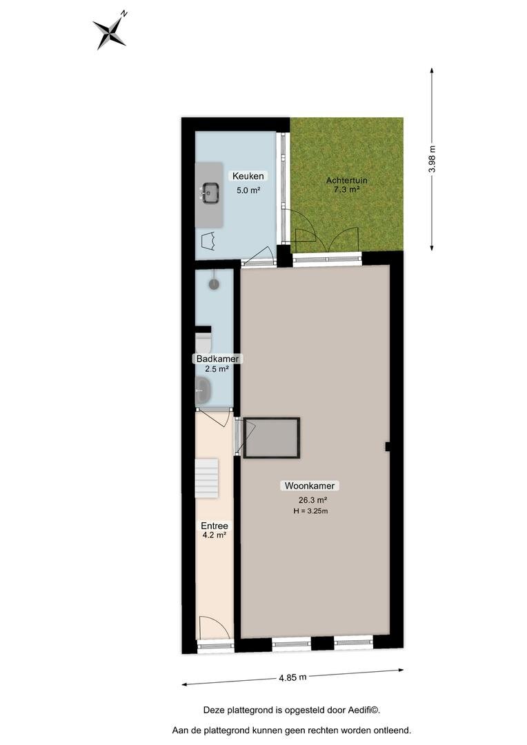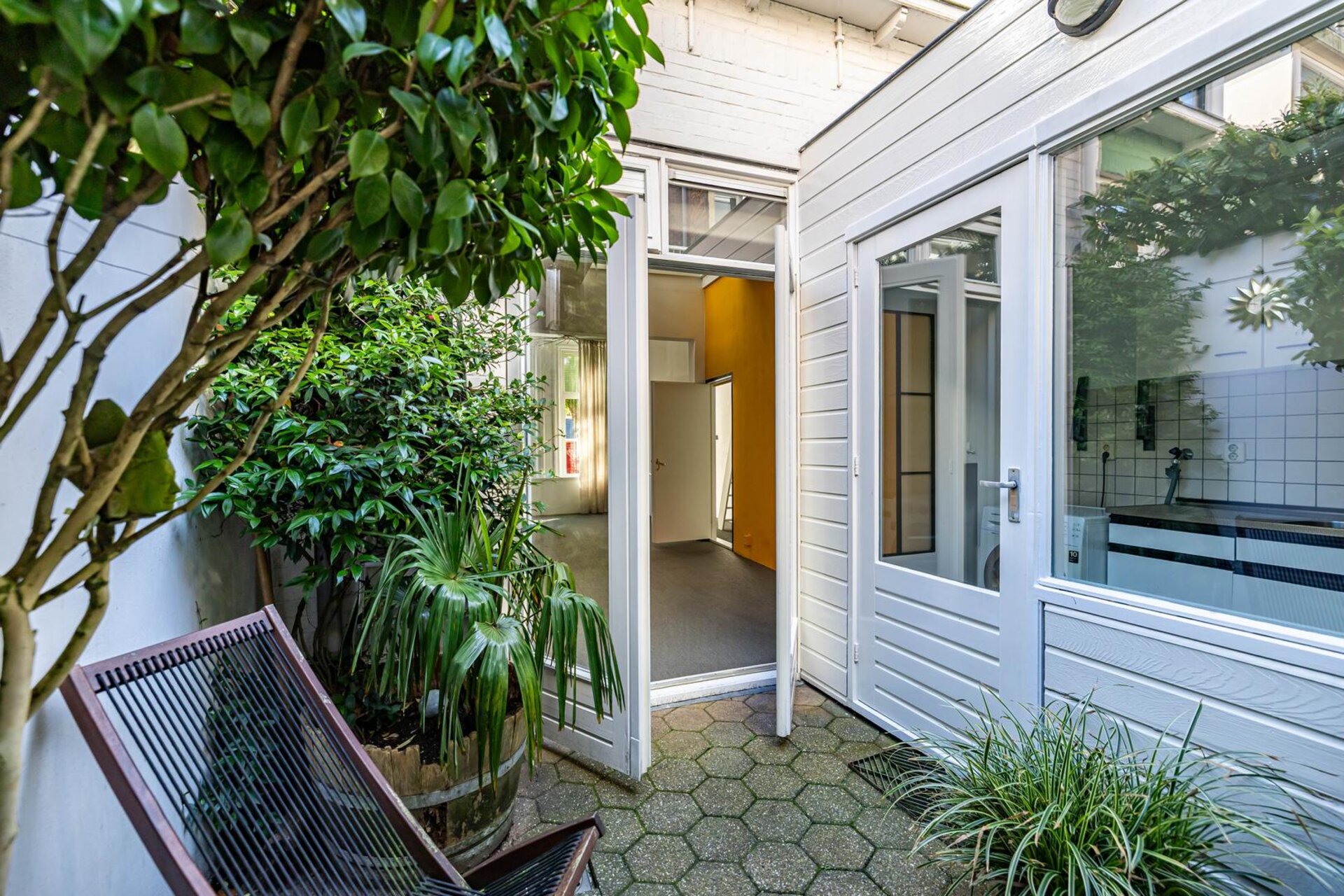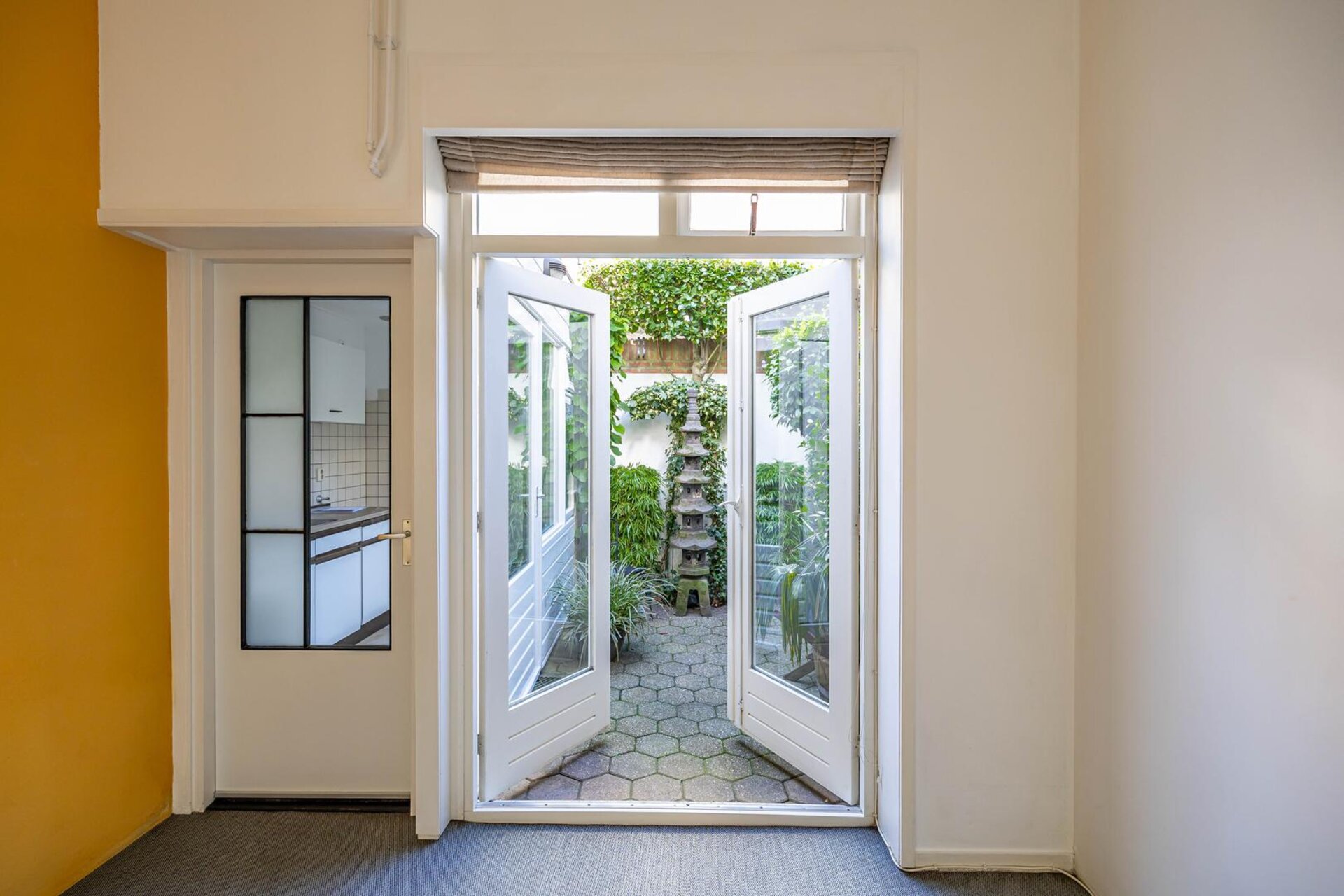Entree - hal met trapopgang - deur naar de badkamer met wastafel, toilet, inloopdouche en mechanische ventilatie - sfeervolle en lichte woonkamer (26m²) met hoog plafond (3,25m), vloerverwarming en openslaande deuren naar een sfeervol tuintje - de keuken (5m²) zit in de uitbouw en is voorzien van een nette eenvoudige keukeninrichting, een wasmachine aansluiting en een deur naar de tuin.