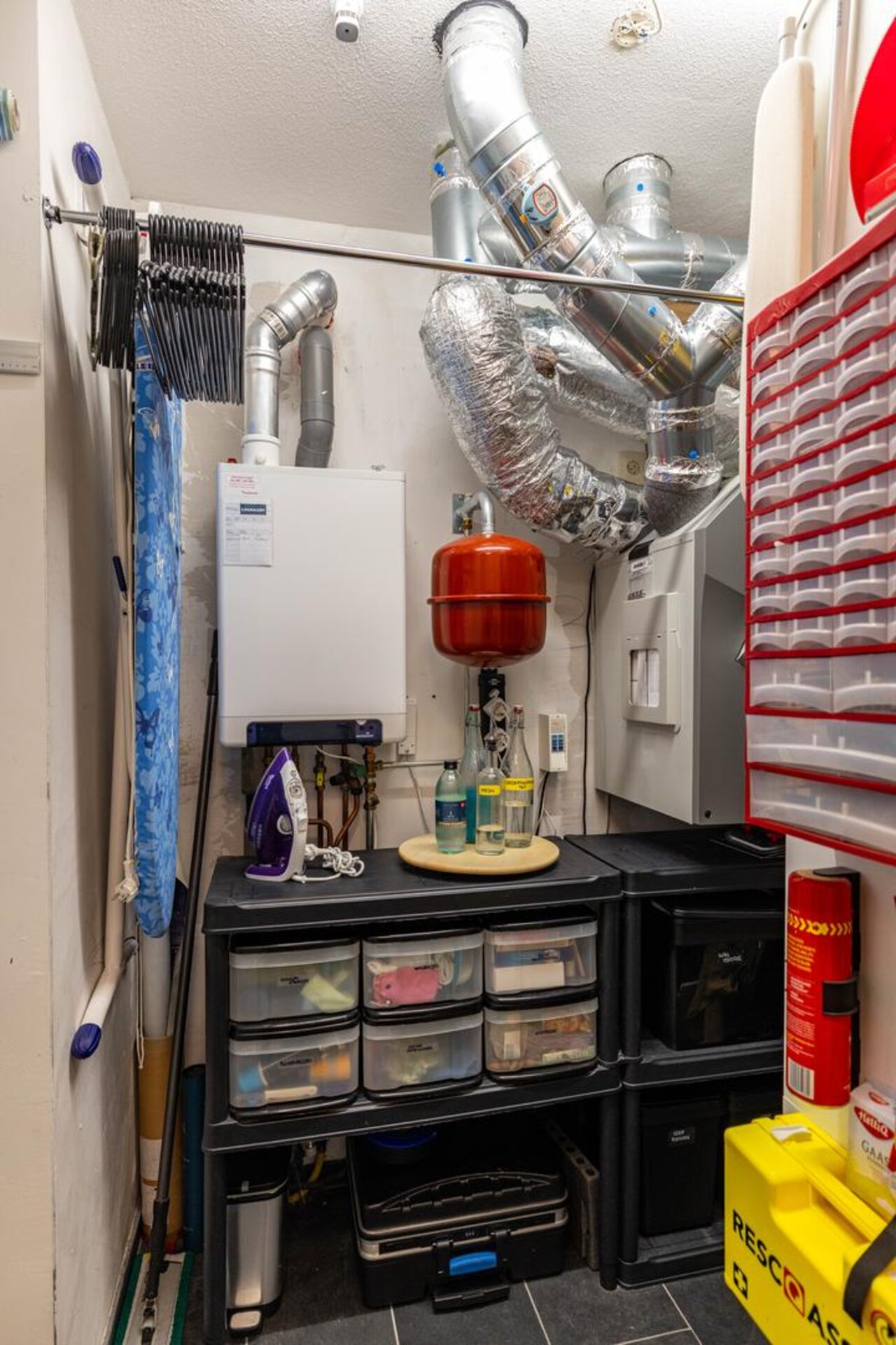 Stook- annex wasruimte met opstelling cv-ketel, warmte-terug-win-systeem en wasmachine aansluiting.