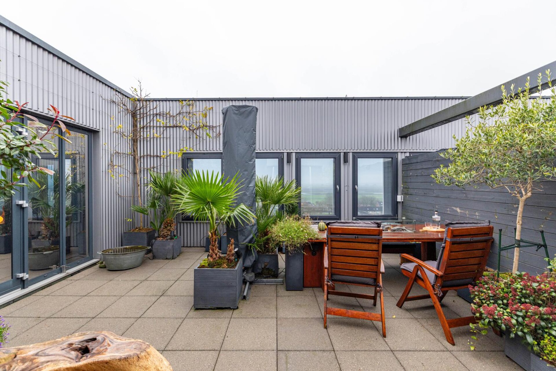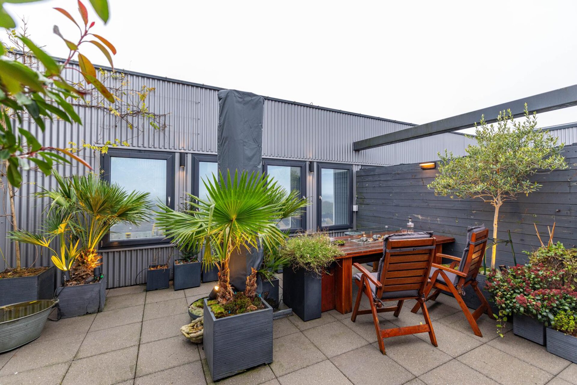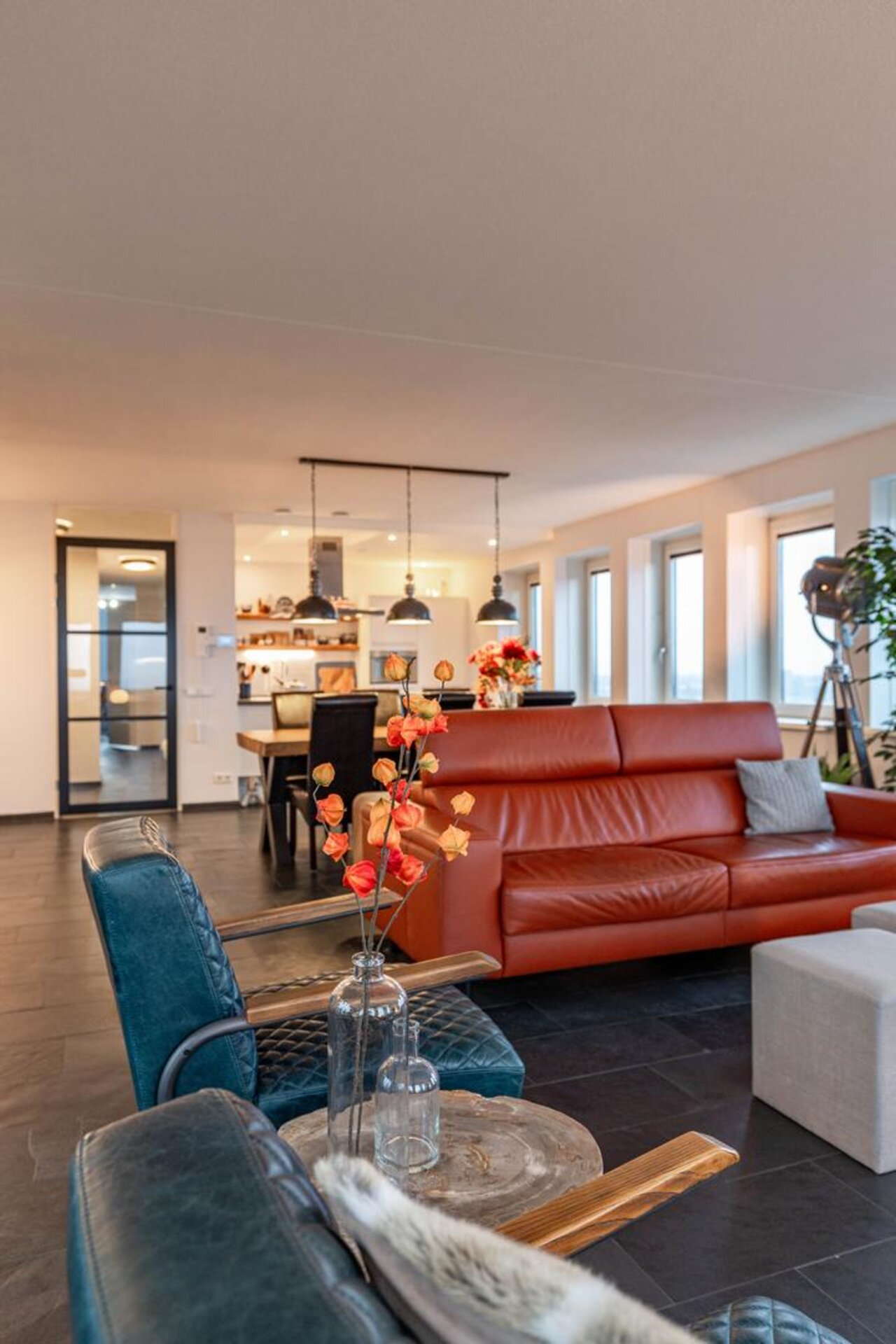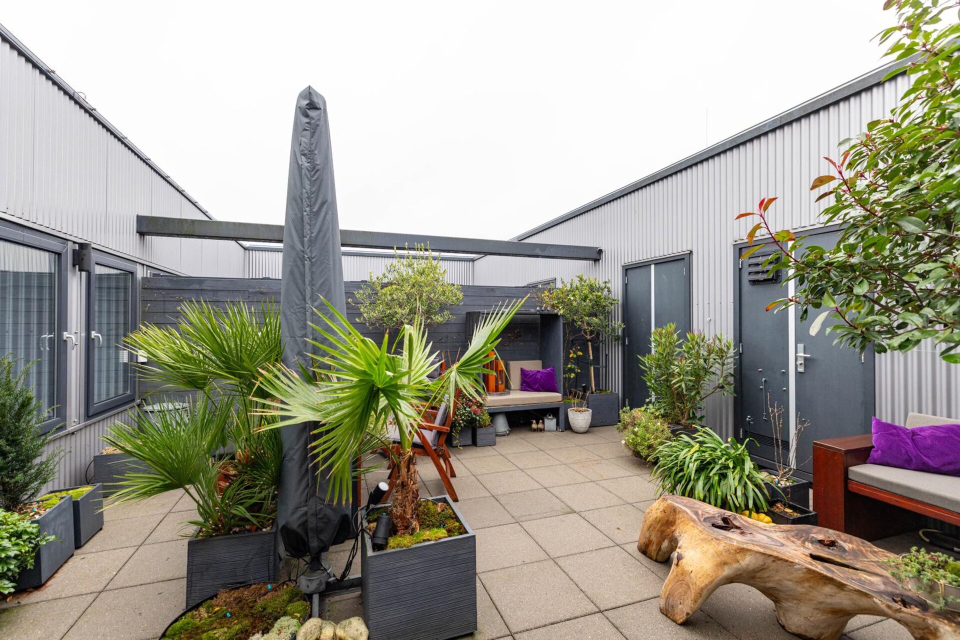 Lichte woonkamer (66m²) met airconditioning en dubbele terrasdeuren naar het royale dakterras (37m²).