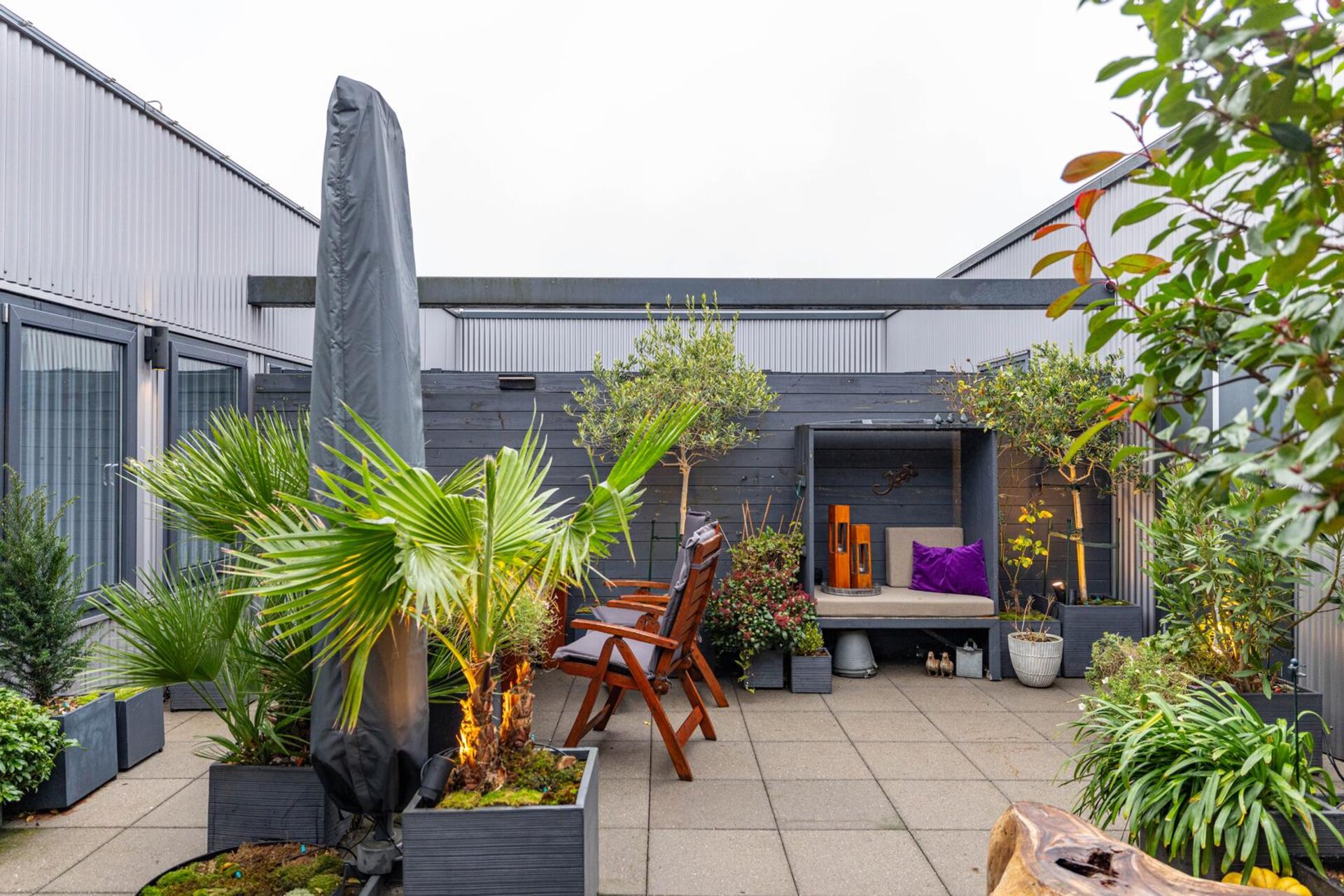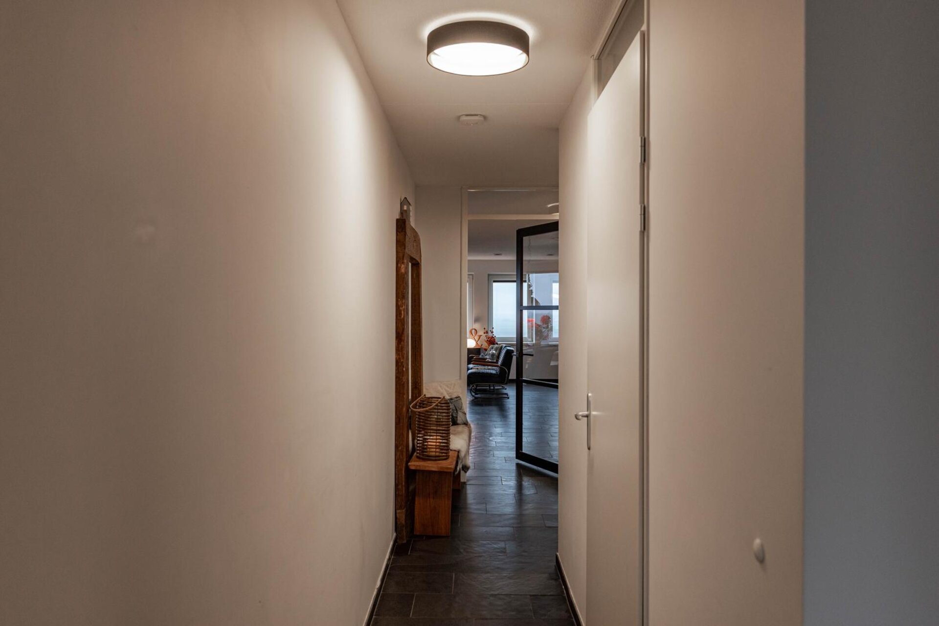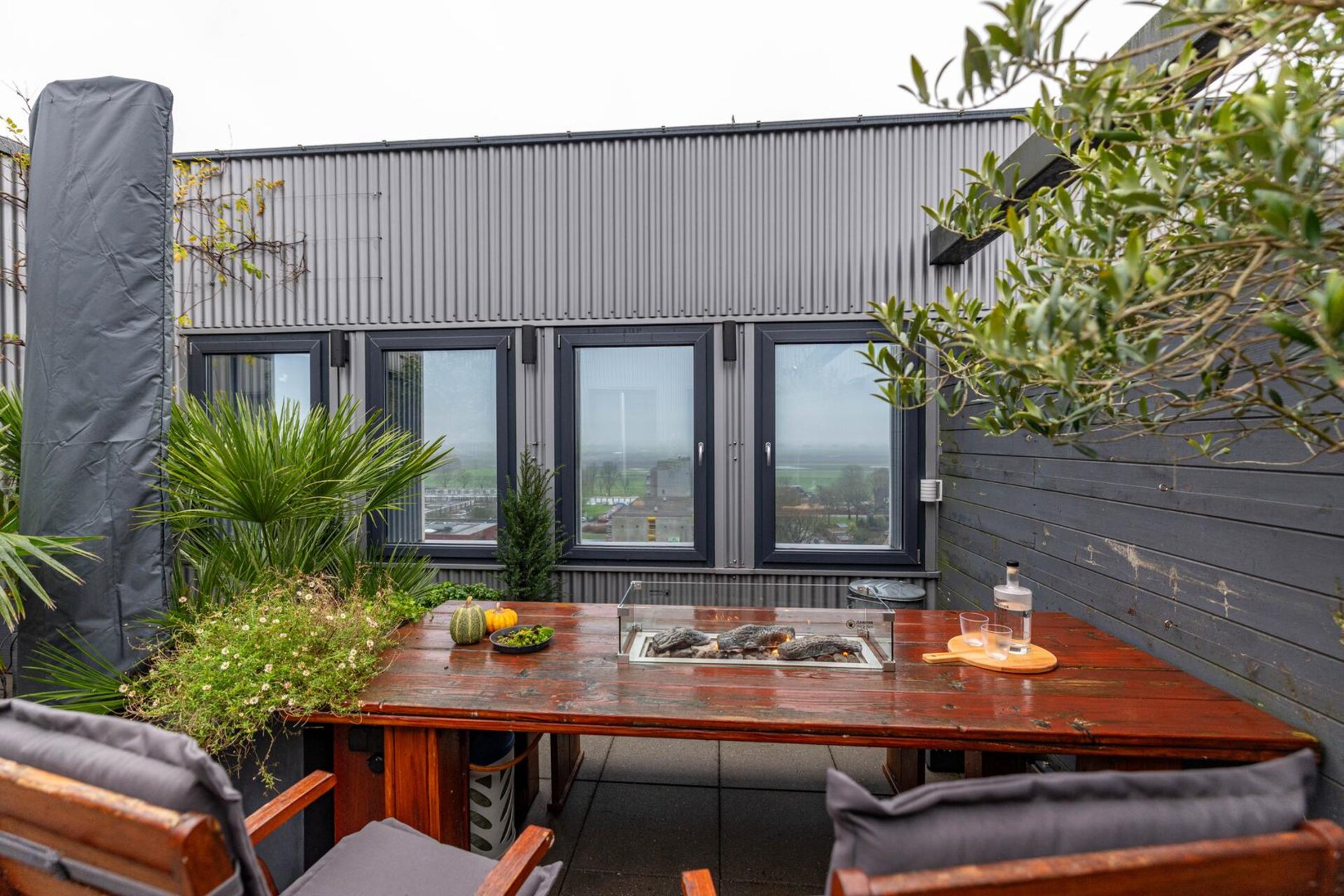 Lichte woonkamer (66m²) met airconditioning en dubbele terrasdeuren naar het royale dakterras (37m²).