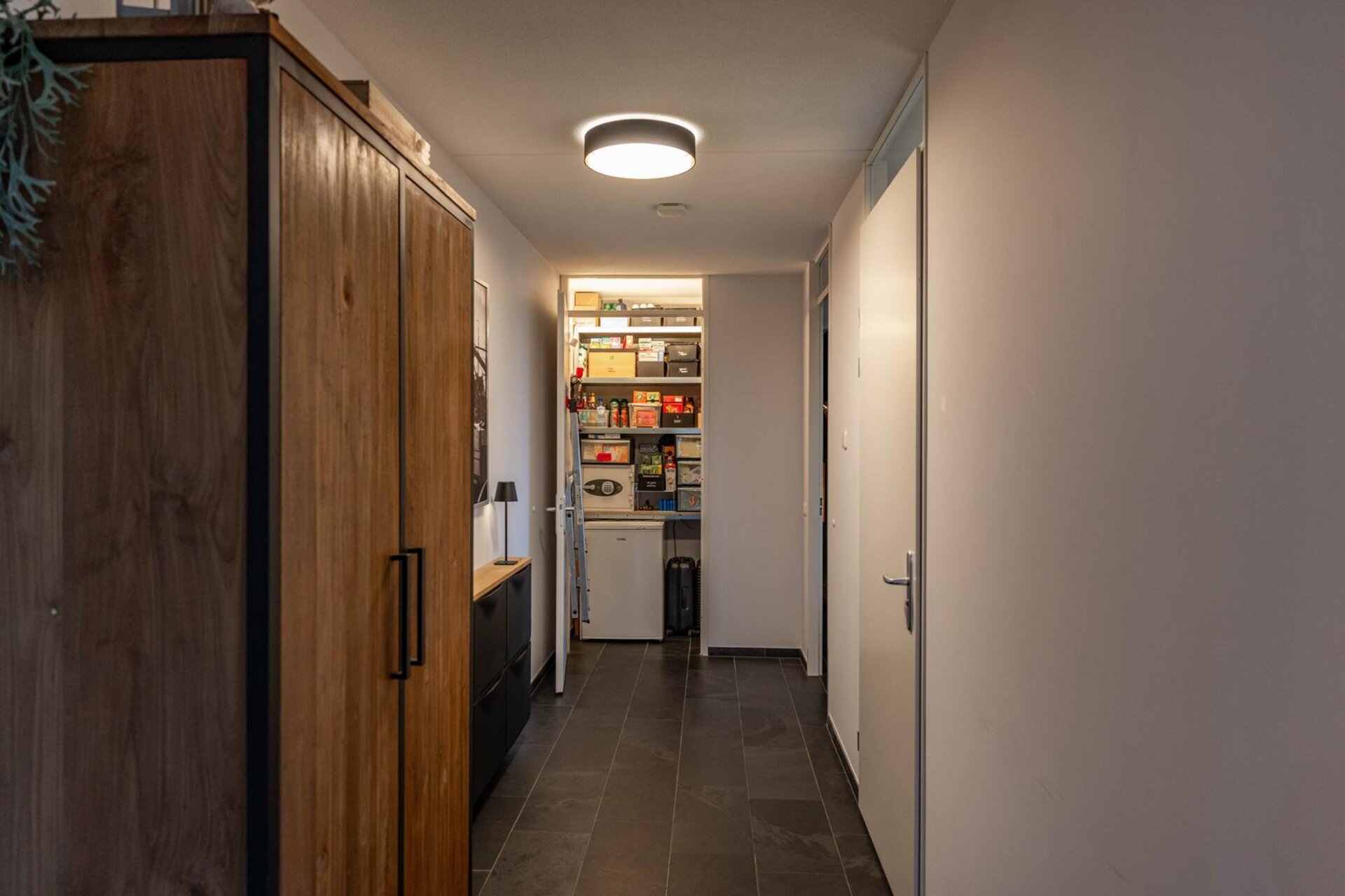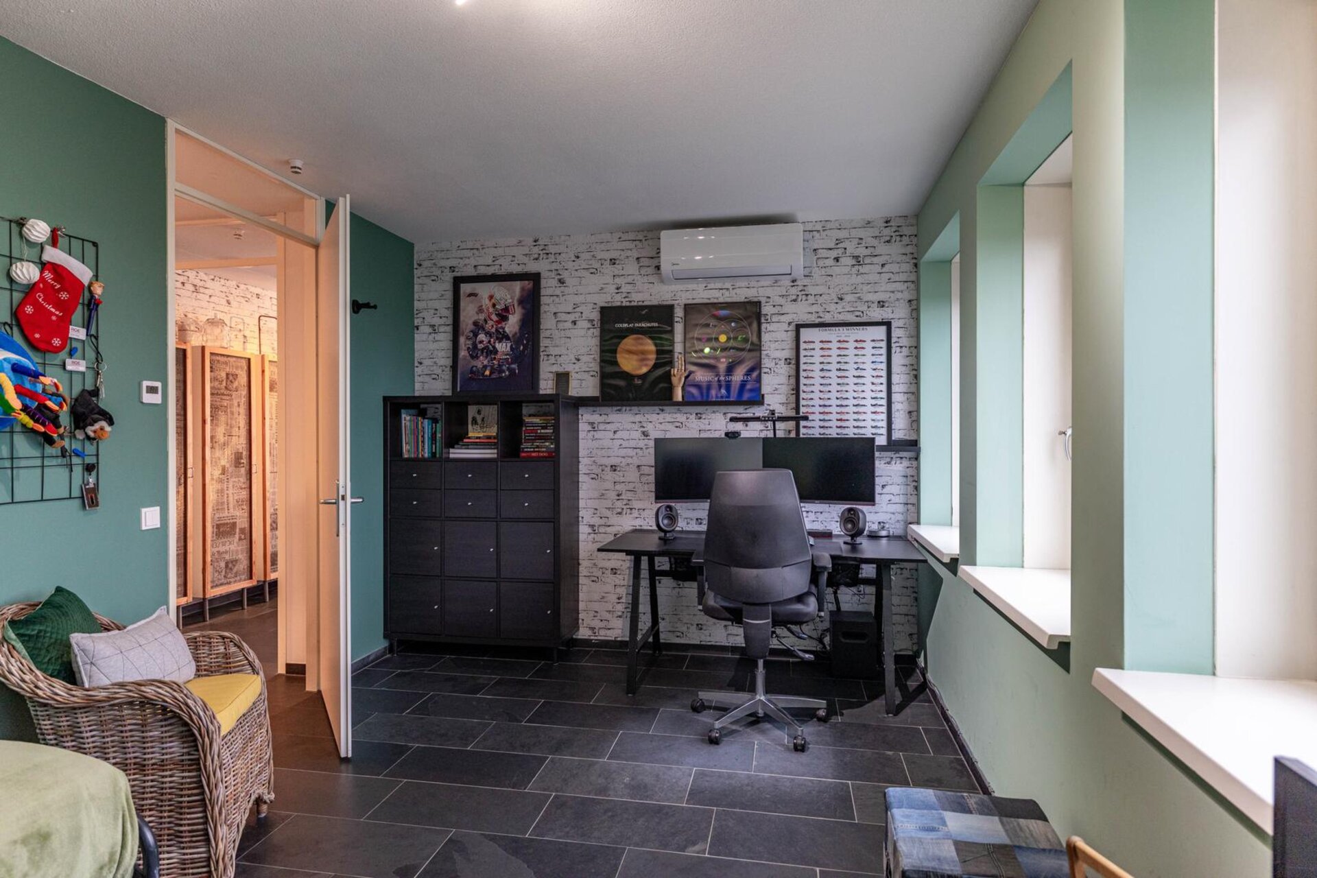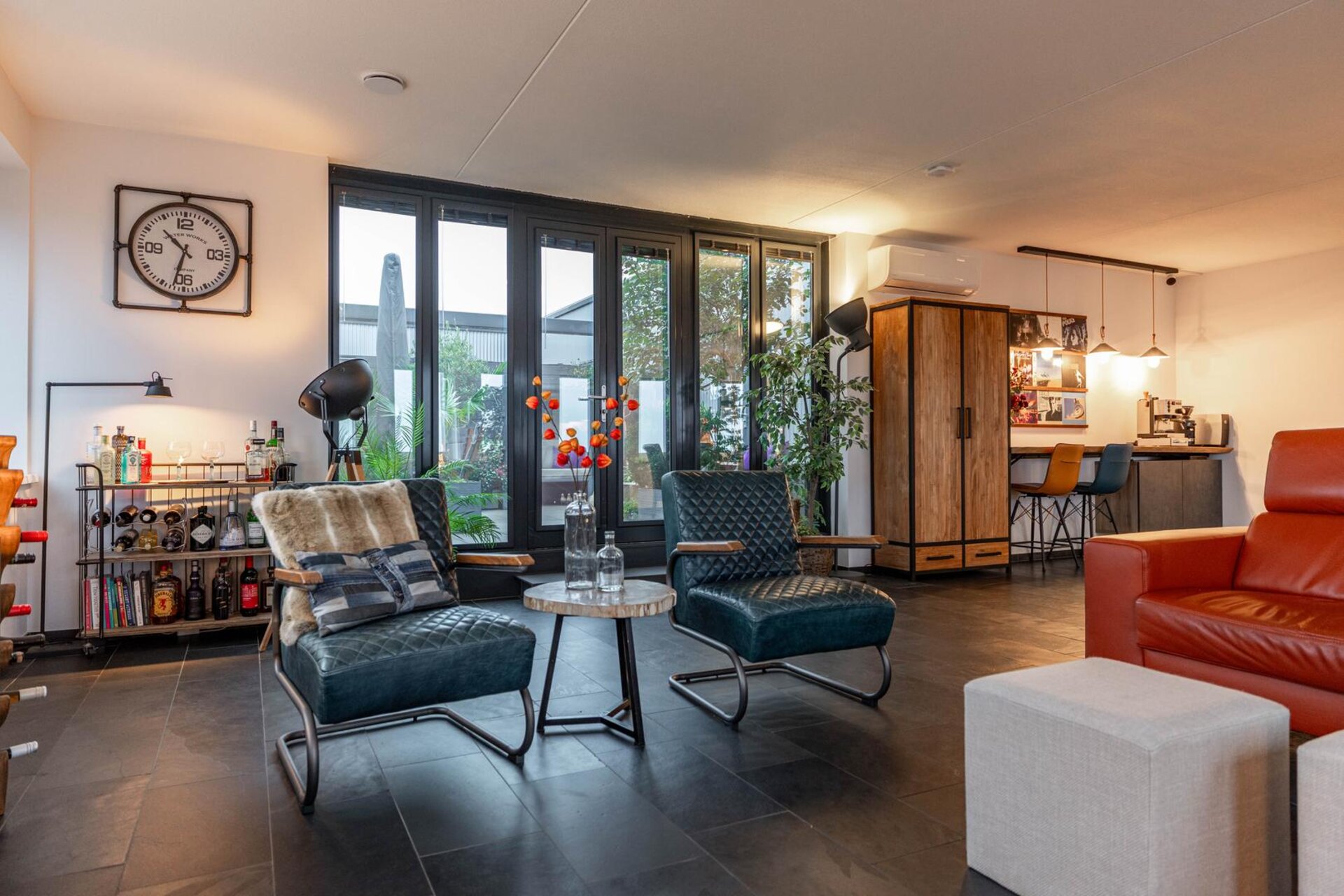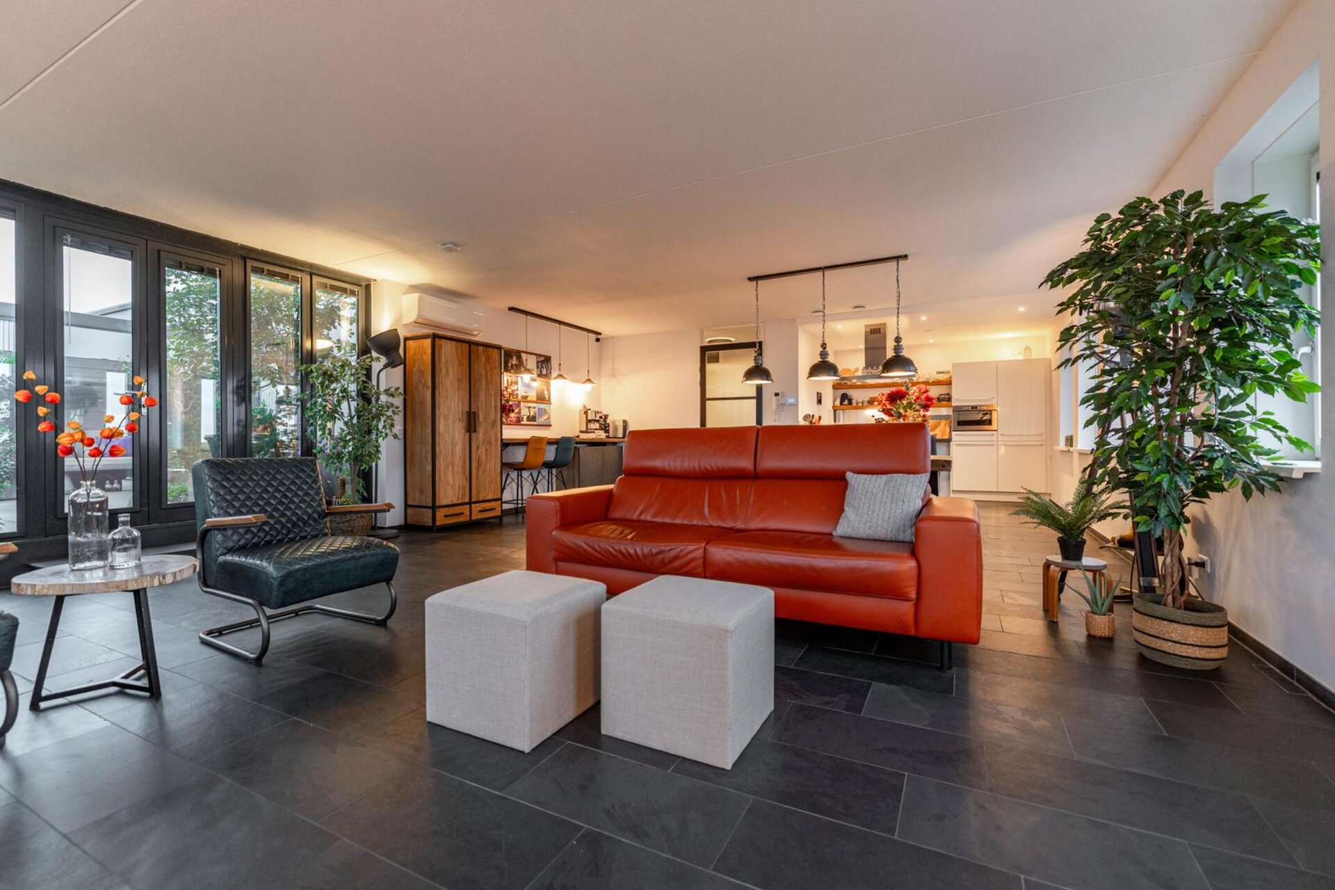 Lichte woonkamer (66m²) met airconditioning en dubbele terrasdeuren naar het royale dakterras (37m²).
