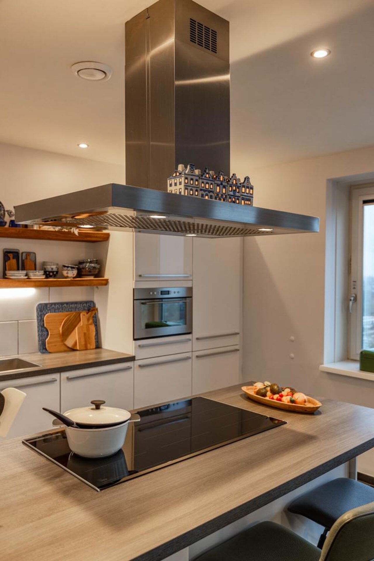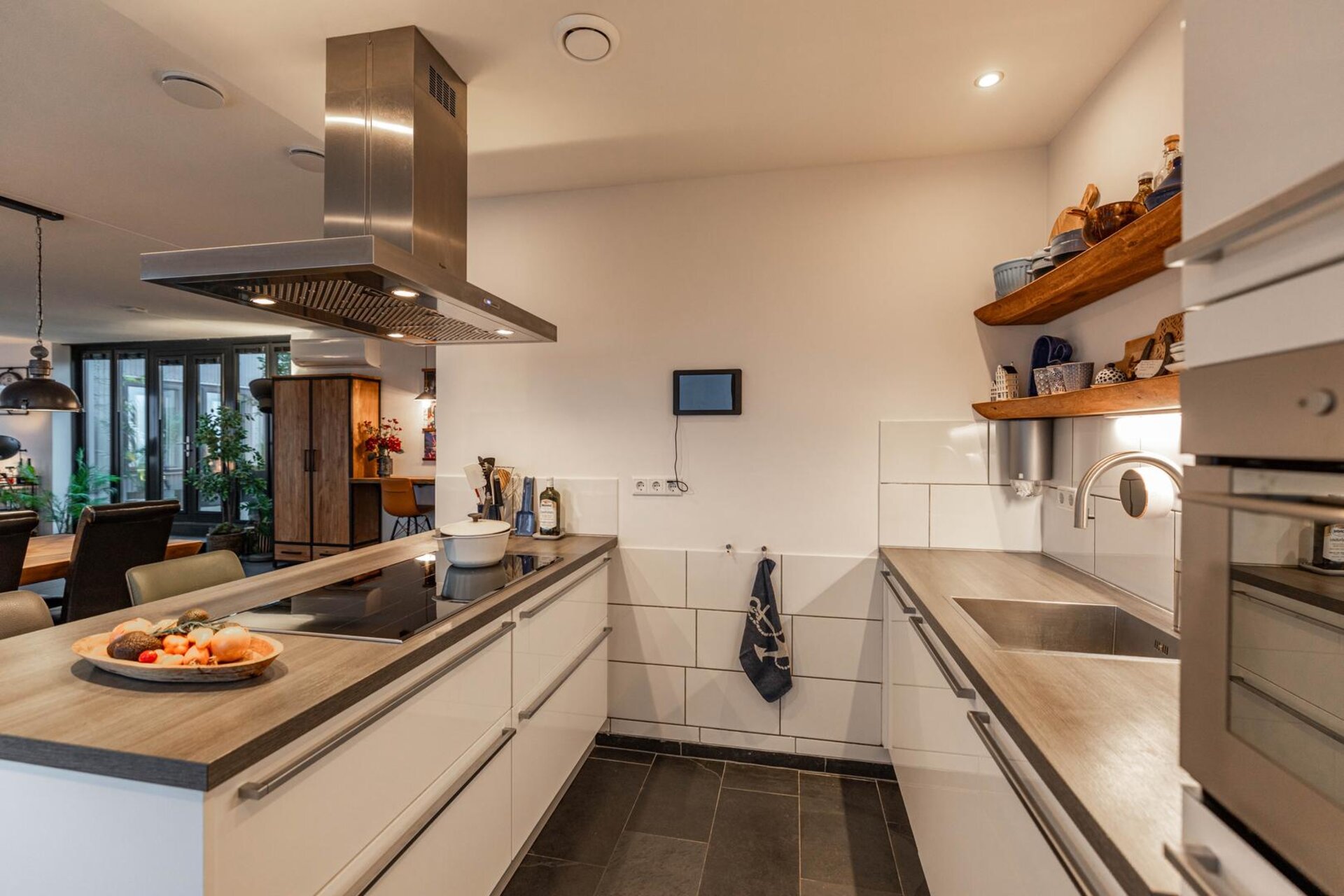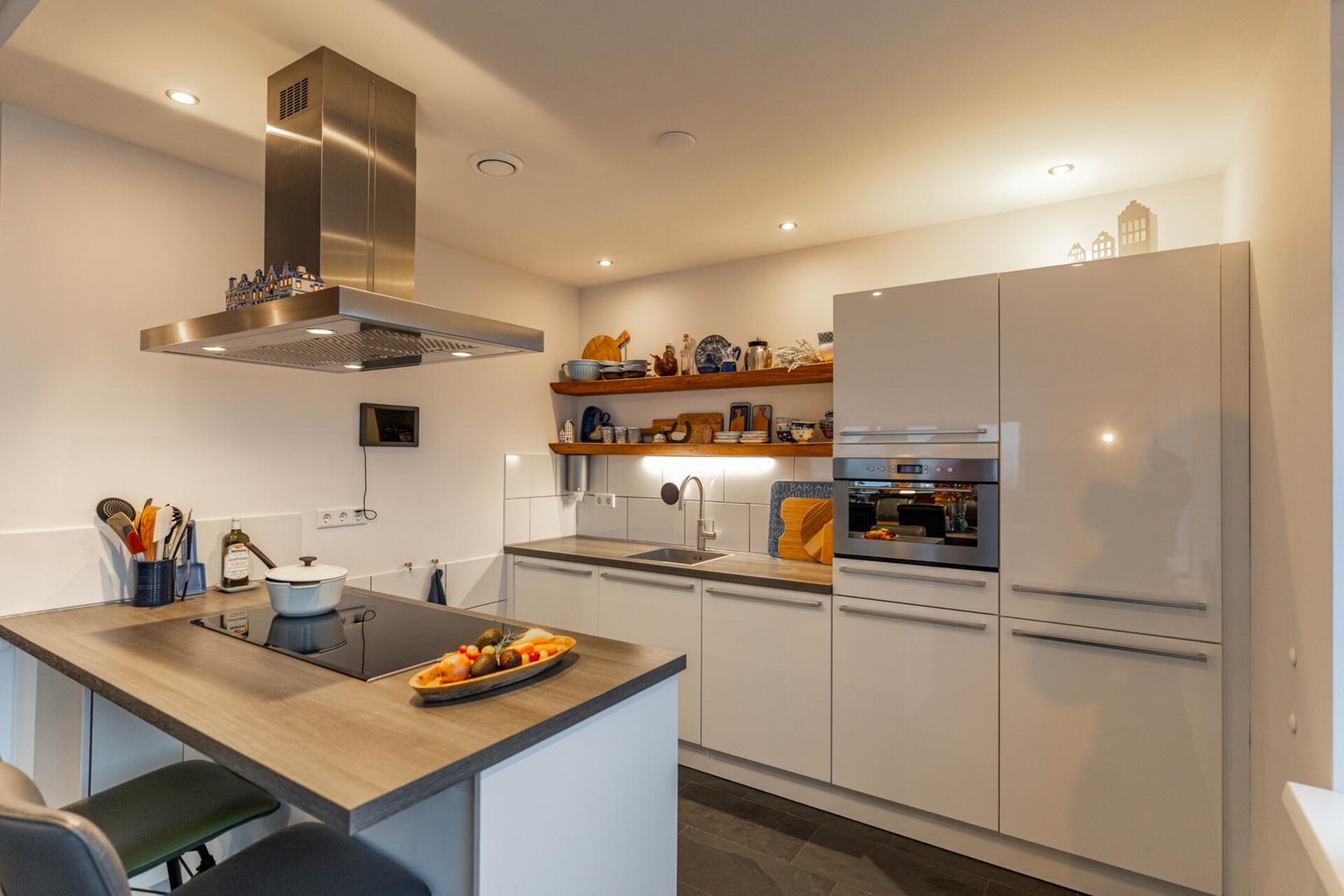Open keuken voorzien van een complete keuken inclusief kookeiland met grote inductiekookplaat, combimagnetron, koel-vriescombinatie, vaatwasser en afzuigkap.