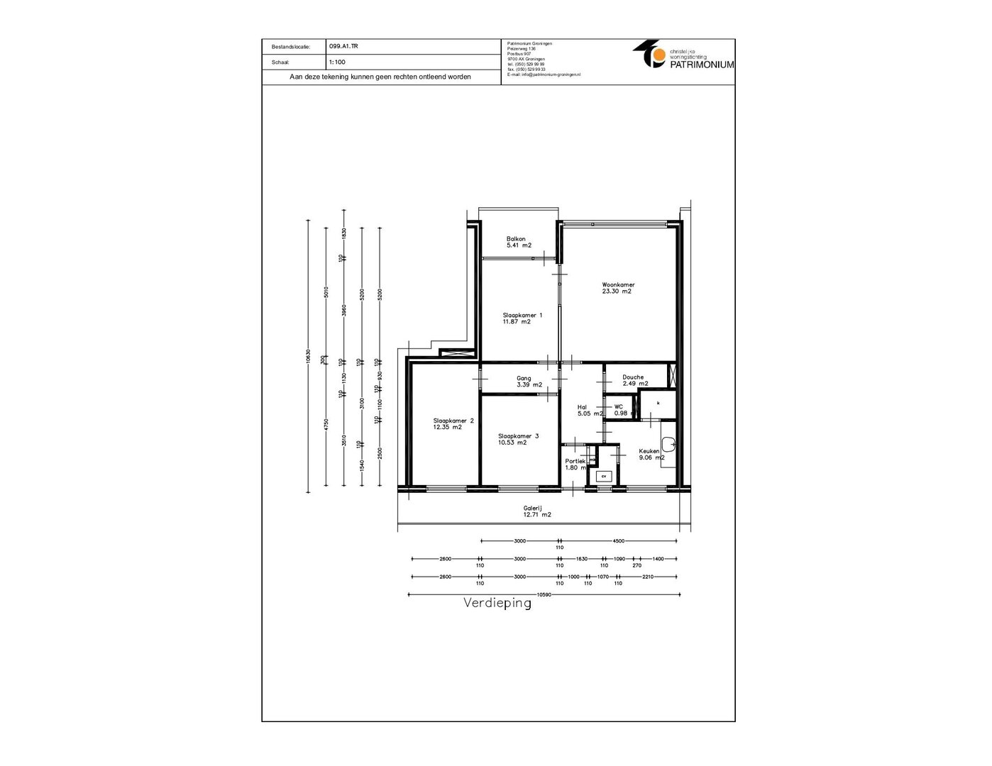 1e woonlaag: entree, tochtportaal met meterkast, hal met toilet en vaste kast, dichte keuken van circa 9m² met provisiekast en CV-kast, woonkamer van circa 23m², slaap/eetkamer van circa 12m² met deur naar het balkon op het zuiden, 2 slaapkamers van resp. circa 11 en 12m², badkamer met douche en wastafel.