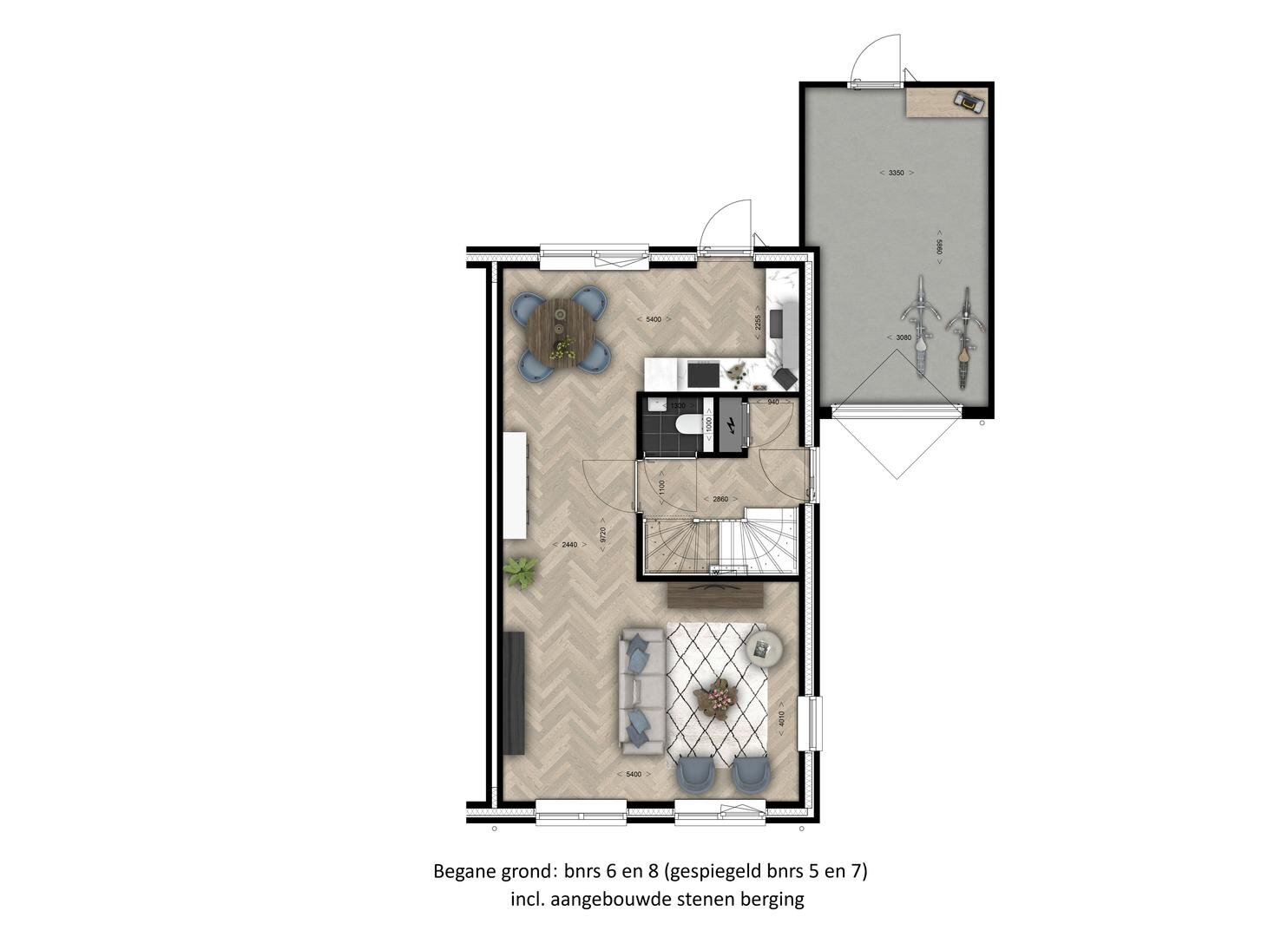 - Inwendige breedte van ca. 5,4 m x 9,72 m diep