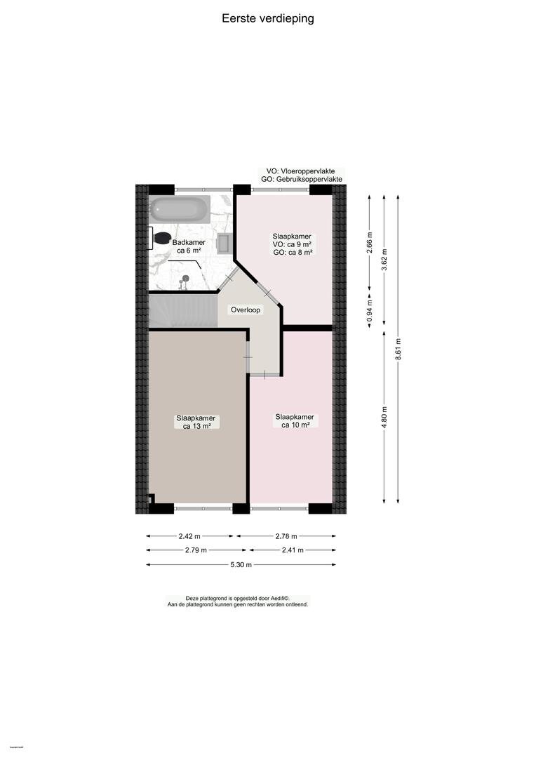 Overloop, 3 slaapkamers (8, 10, 13 m²), een verzorgde complete badkamer met inloopdouche, wastafelmeubel, ligbad, toilet en handdoekradiator.