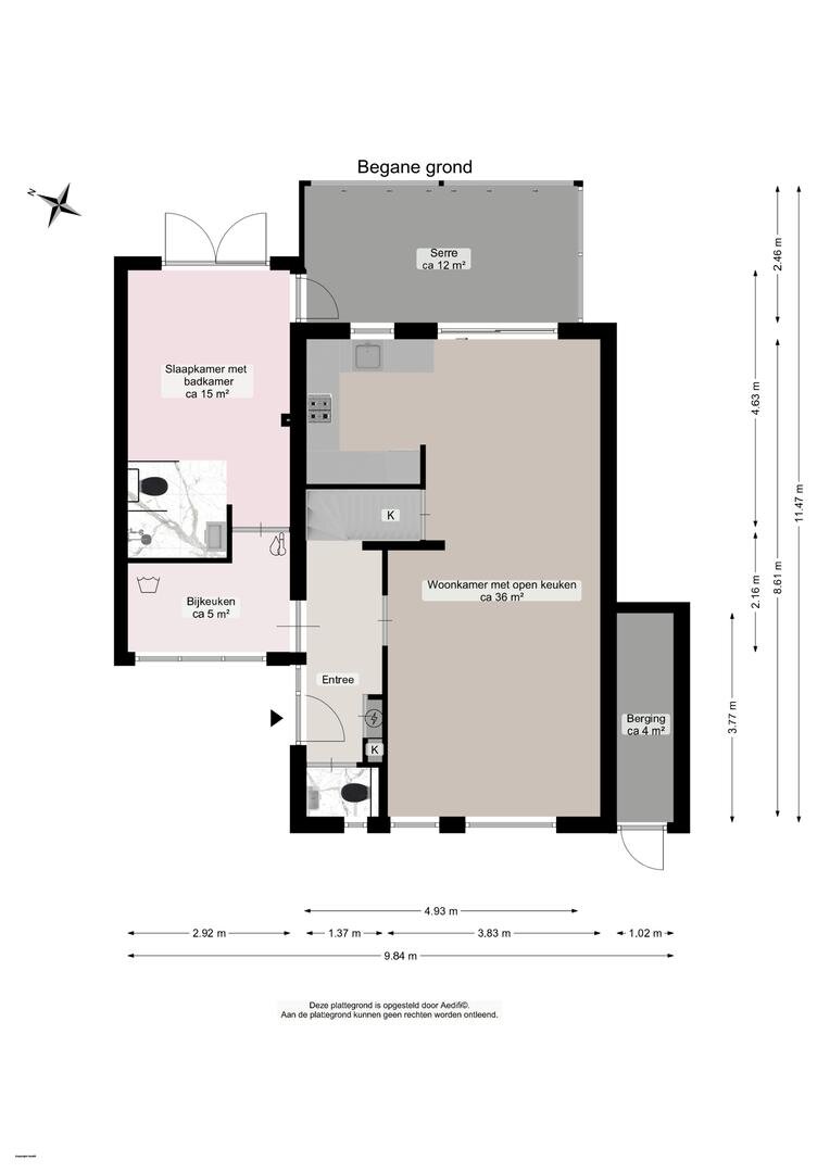 Entree, hal, toilet (zwevend) met fonteintje, trapopgang en deur naar de (voormalige)garage: bijkeuken met wasmachine aansluiting, slaapkamer (15 m²) met tuindeur en fraaie nieuwe badkamer met inloopdouche, wastafelmeubel en vloerverwarming.
